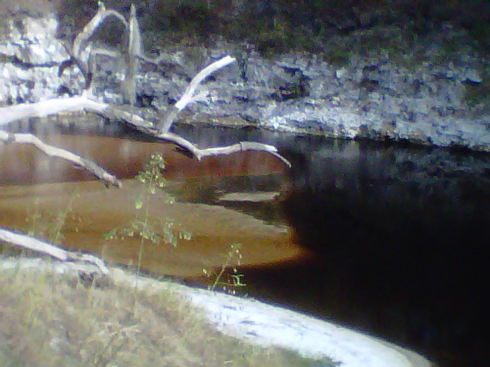 After about two hours of constant paddling and pulling, we found a nice spot for lunch. The river had started to get somewhat deeper here, but narrower also. Jetting out into the river was a bunch of sharp and large boulders. Jim and I talked about what kind of rocks they were, because of their unusual straight and sharp edges. To be honest, the rock looked similar to flint rock that Indians use to make arrow heads. Anyway, if the water would have been high, this section of the river would have been fun to paddle due to the rough water caused by these boulders. Anyway, it was a great place for lunch.
